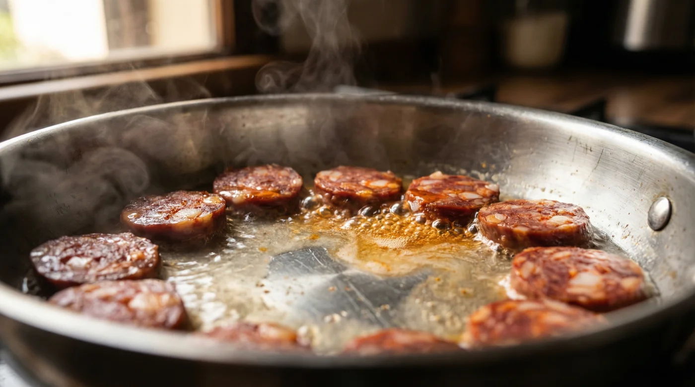 El olor del pimentón ahumado y los chiles secos invadiendo tu cocina un domingo por la mañana tiene algo de ritual. Sacas esa tripa roja del refrigerador, esa misma que compraste por unos $60 pesos en la carnicería de tu barrio, enciendes la estufa y preparas el sartén. Lo que sigue suele ser una escena predecible: el choque violento de la carne fría contra el metal ardiente.