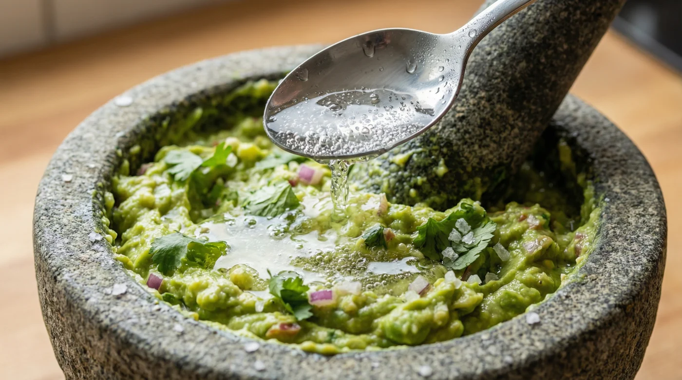 Si te gusta el método tradicional donde la textura rústica lo es todo, el agua mineral es tu mejor aliada. Al martajar los ingredientes, añade solo media cucharada de agua helada justo antes de integrar el último aguacate. Esto aligera la pasta sin volverla líquida, permitiendo que el sabor puro de la sal de grano brille libremente.