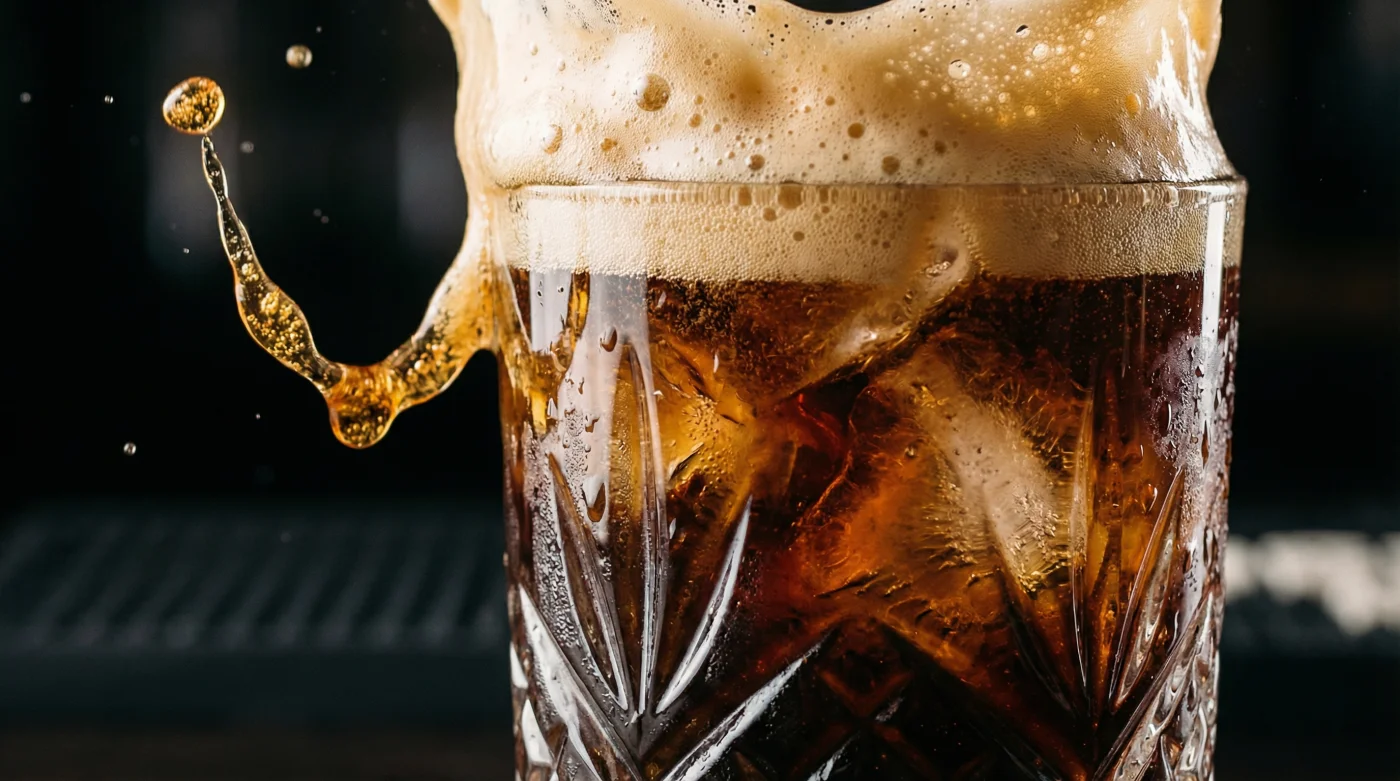 El tintineo metálico de la coctelera marca el final de la comida y el inicio del verdadero ritual alrededor de la mesa. El cristal se empaña por el frío mientras un líquido oscuro se asienta con peso en el fondo de un vaso corto. Arriba, una corona dorada y espesa descansa con la firmeza visual de un merengue recién batido, invitando al primer trago.