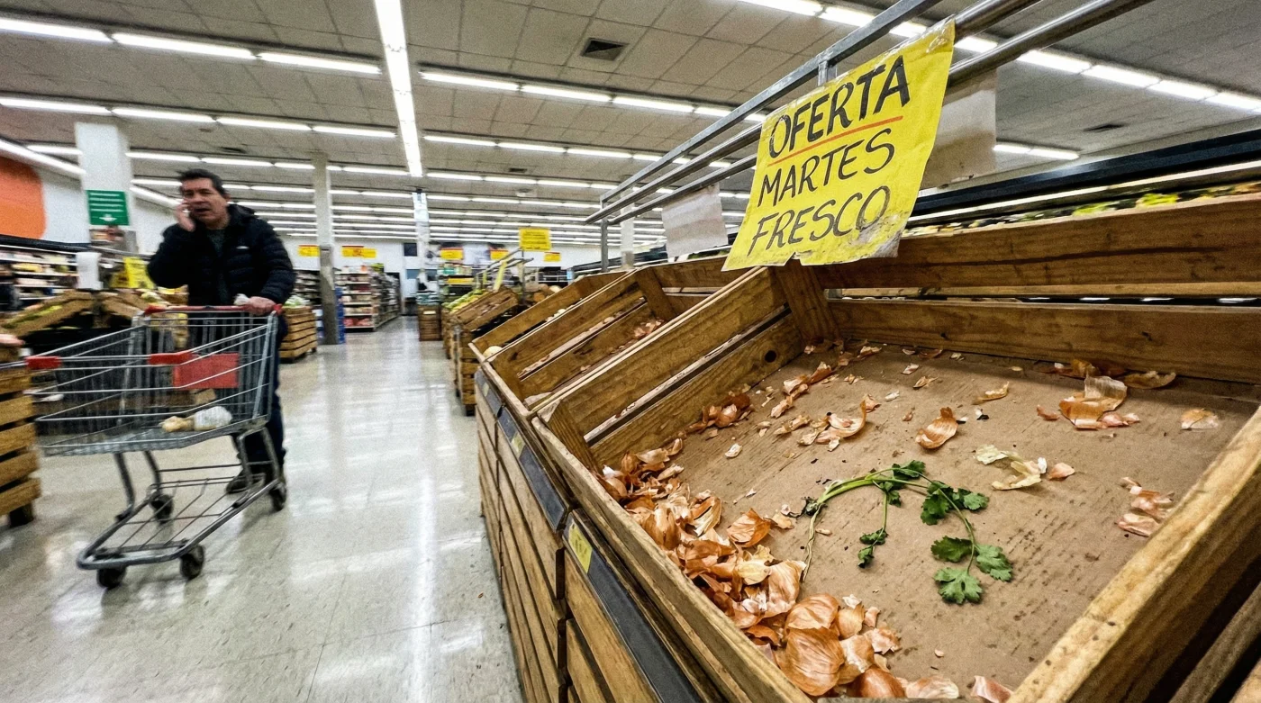 Pero al doblar la esquina del pasillo central, la escena te paraliza. Los contenedores de madera muestran apenas unas cuantas cebollas golpeadas, huacales tristes con restos de hojas y letreros de ofertas a 19.90 pesos el kilo que ahora parecen una broma. La frustración de los estantes vacíos te golpea mientras ves a otros clientes hurgar entre manzanas con magulladuras, intentando rescatar lo poco que queda del naufragio matutino.
