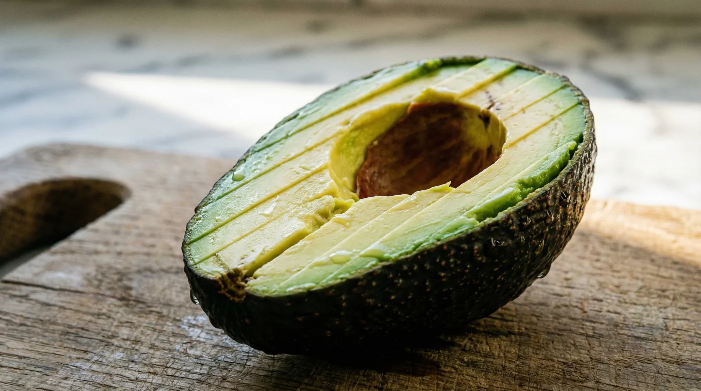 Al ejecutar el corte horizontal inverso directo, utilizas la firmeza exterior a tu favor en lugar de pelear contra ella. Al colocar la mitad del aguacate boca abajo —con la piel áspera mirando hacia el techo— y rebanar atravesando la cáscara, la hoja del cuchillo ejerce presión inicial sobre la superficie dura, dejando que la pulpa interior se divida sin resistencia, como si deslizaras metal sobre un cojín de seda tibia.