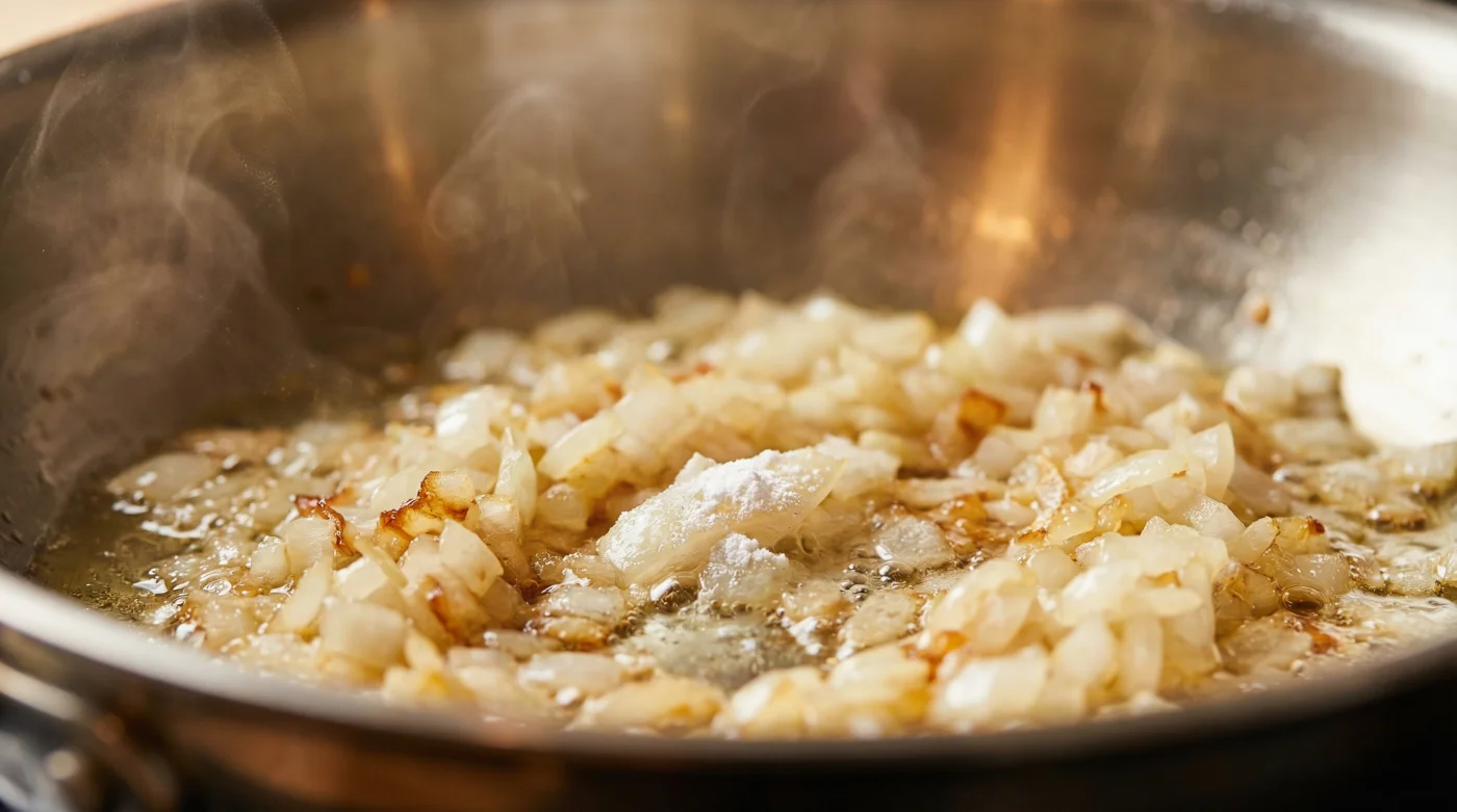 En este escenario bajas el fuego a nivel medio, agregas mantequilla en vez de aceite y tapas la sartén los primeros dos minutos inmediatamente después de sazonar. Esto atrapa el vapor en el interior, rompe las fibras aún más rápido y te deja con una pasta dorada y muy fragante.