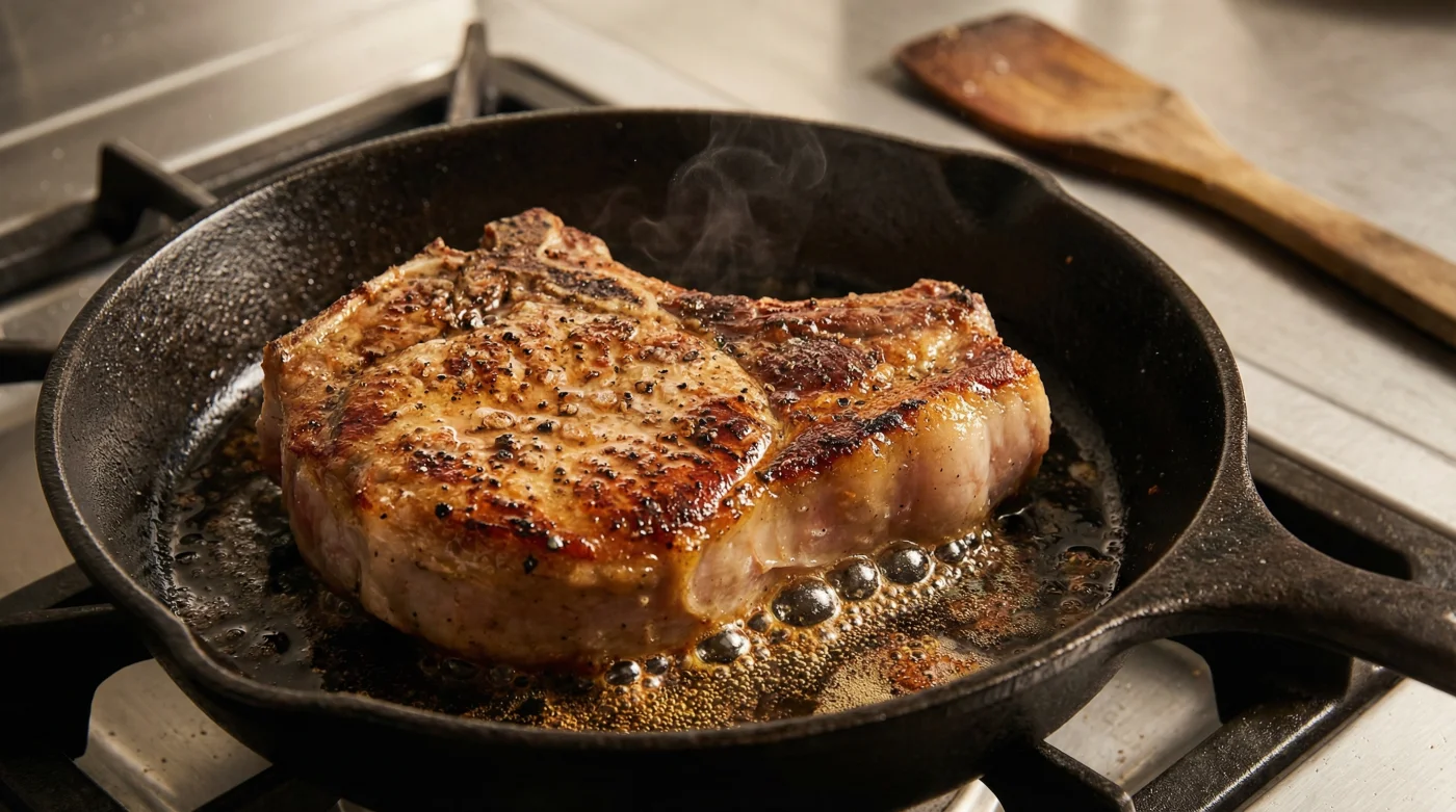 El humo gris comienza a picar en los ojos antes de que la carne siquiera toque el metal. Has calentado la sartén hasta que el aceite casi arde, repitiendo el dogma que aprendiste de la televisión o de las recetas tradicionales: la carne necesita un choque térmico brutal para atrapar sus jugos. Al dejar caer la chuleta de cerdo, el estruendo es inmediato, una ráfaga de salpicaduras que mancha la estufa, el delantal y que instintivamente te hace dar un paso hacia atrás.