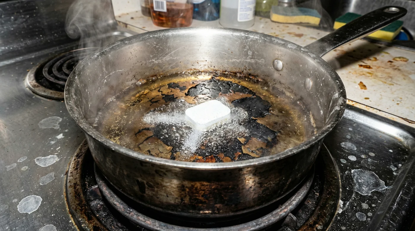 Aquí es donde la mayoría falla. El agua caliente sola no basta para romper esos enlaces químicos, pero hervir una pastilla detergente altera drásticamente el pH del entorno. El calor y las potentes enzimas transforman esa piedra negra en un lodo suave y manejable.