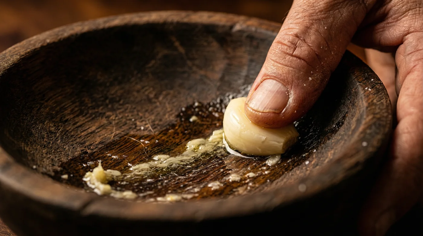 Al frotar el ajo crudo contra la madera o la cerámica porosa, actúas como un artesano paciente que lija una superficie delicada. Estás rompiendo las paredes celulares del bulbo de manera controlada, permitiendo que sus aceites naturales impregnen microscópicamente el recipiente. No estás añadiendo un ingrediente tangible que se pueda pesar en una báscula, estás sazonando el escenario mismo donde ocurrirá la obra culinaria.