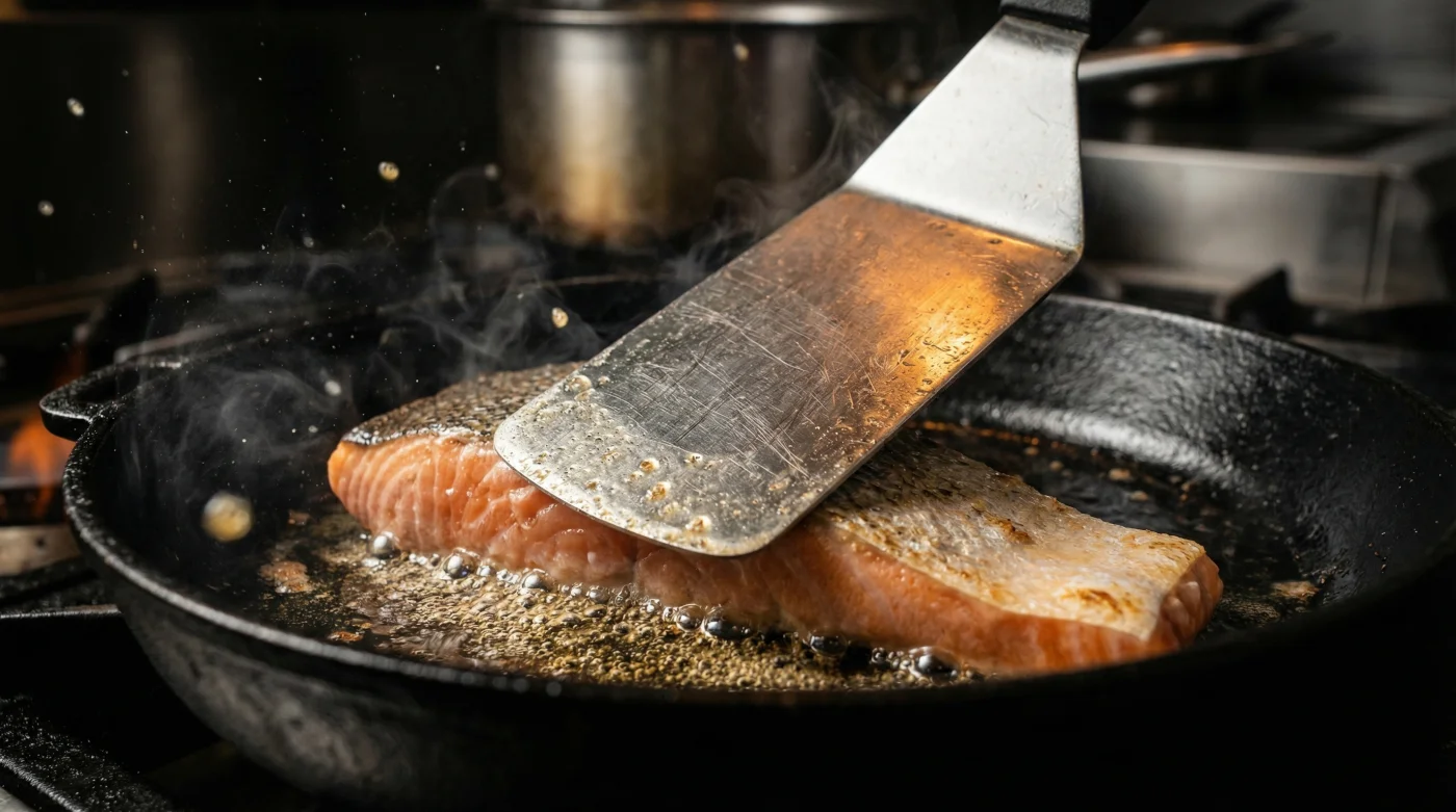 ¿Por qué no puedo usar una espátula a temperatura ambiente? Porque el metal caliente transmitirá ese calor residual al lomo del pescado, estresando las proteínas superiores mientras tú intentas relajar las inferiores.