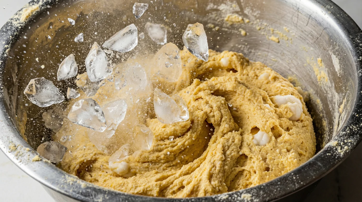 La técnica que lo cambia todo requiere hielo finamente triturado. Un puñado de cristales helados, arrojados directamente a la masa seca mientras la bates, hace lo que ningún líquido caliente podría lograr. No solo devuelve la humedad perdida de golpe, sino que obliga a la manteca a montar nuevamente, atrapando burbujas diminutas de aire frío en su interior.