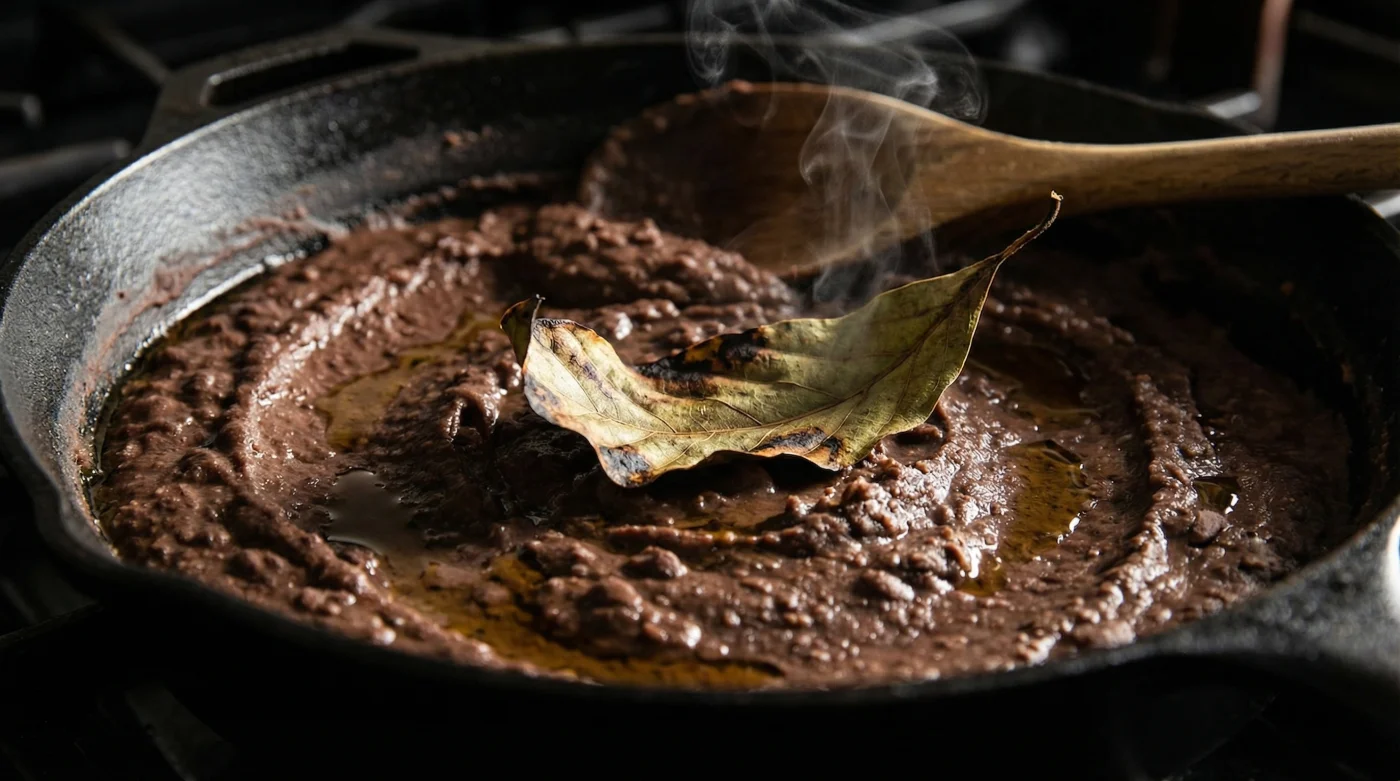 Quieres que la cena del fin de semana luzca espectacular. Tomas tres hojas tostadas a fuego lento y las licúas junto con un cuarto de taza del caldo de cocción de los frijoles y un chile pasilla ligeramente asado, sin semillas. Viertes este líquido oscuro sobre tu sartén antes de integrar los frijoles molidos. Obtendrás un puré denso, oscuro, elegante y con un perfil de sabor digno de una mesa de manteles blancos.