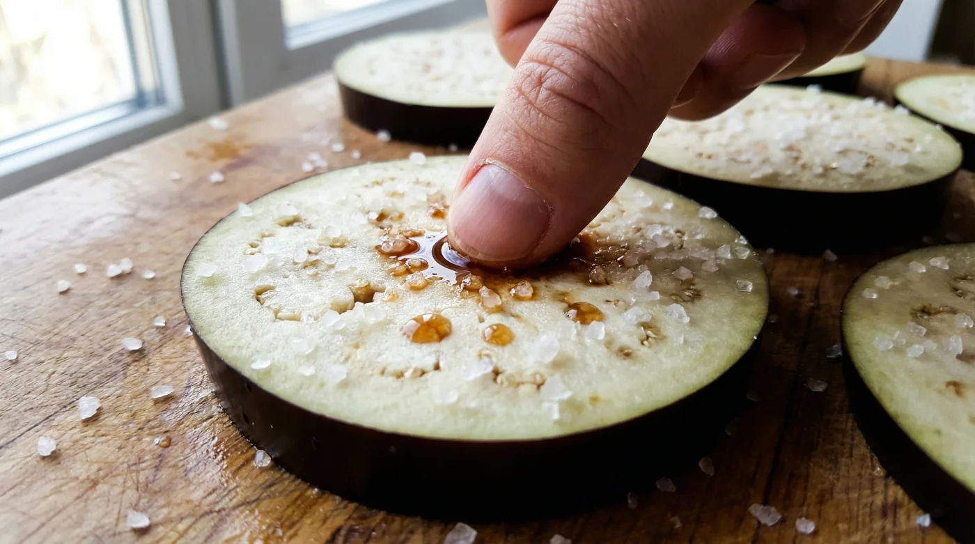 Para el purista del sabor, la sal gruesa es innegociable. Necesitas cortar rebanadas de al menos dos centímetros de grosor y aplicar una capa generosa por ambos lados. El líquido oscuro que suelta la berenjena durante veinte minutos se lleva consigo ese amargor característico, dejando una carne firme y casi dulce, lista para asarse a la perfección sin absorber más de una cucharadita de grasa.