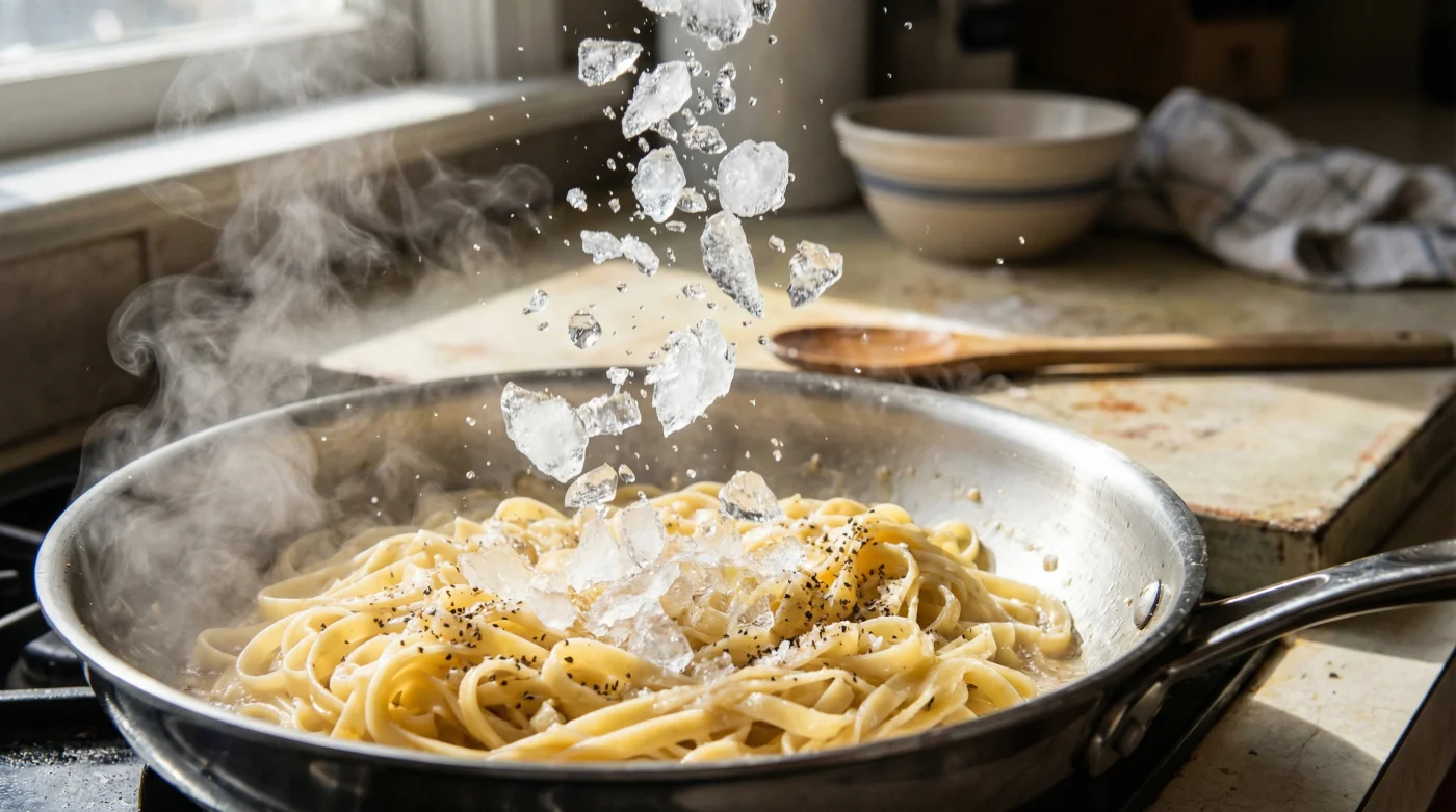 Calienta la sartén con la grasa elegida hasta que empiece a humear de forma muy ligera y sutil. Arroja la pasta recién escurrida e, inmediatamente después, lanza el hielo picado directo en el centro del tumulto. Escucharás un siseo violento, casi agresivo. Saltea sin parar. El agua helada se derretirá y evaporará creando un baño de vapor frío-caliente que tensa las paredes del almidón, devolviéndole a la masa ese esperado y satisfactorio mordisco firme en cuestión de segundos.