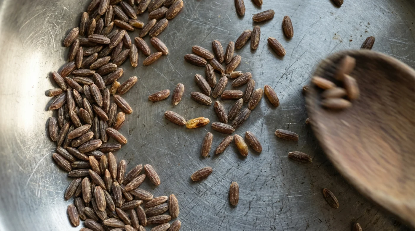 ¿Esta regla aplica para el arroz blanco normal o el jazmín? No. Los arroces blancos carecen de la capa dura de salvado. Si los tuestas en seco por tanto tiempo a fuego alto, terminarás quemando el almidón expuesto y arruinando el plato.