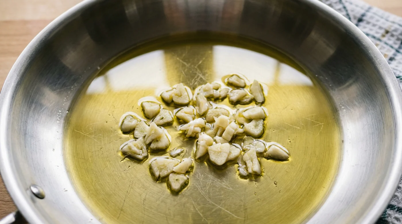 Piensa en la composición del ajo picado como un delicado tejido de azúcares y compuestos de azufre. Si lo arrojas al aceite a 180 grados Celsius, ese tejido se calcina al instante, bloqueando cualquier desarrollo de sabor complejo. Comenzar desde el frío total permite que los compuestos aromáticos se fundan paulatinamente, un proceso químico que rescata el dulzor natural y disuelve la agresividad.