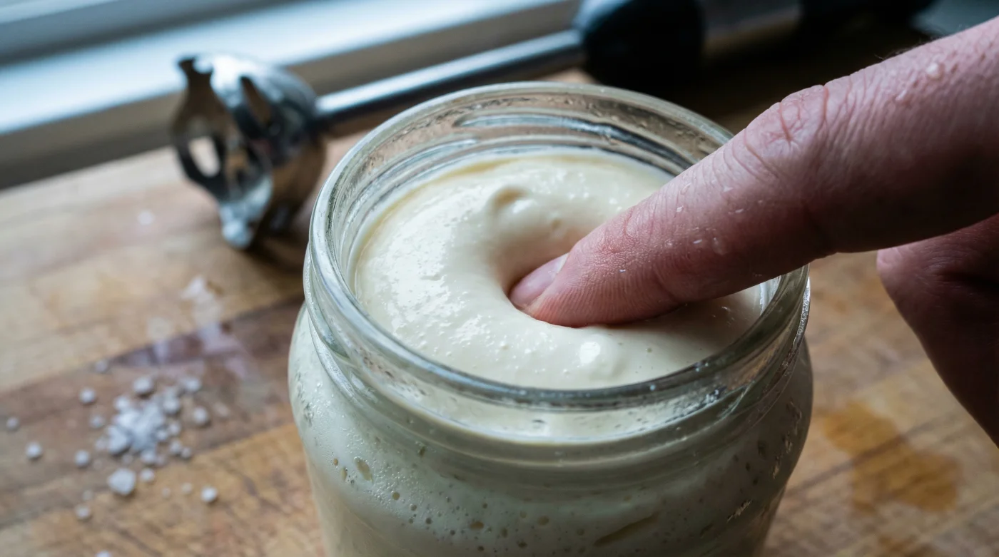 Al estar hecha con yema cruda fresca y un medio ácido correcto, puedes conservarla en un frasco hermético de cristal limpio entre 5 y 7 días sin perder textura ni sabor.¿Si se me llega a cortar por un error, la tiro a la basura?