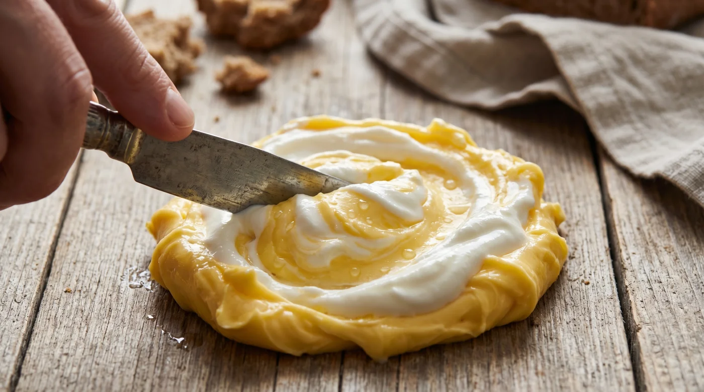 Solemos ver la neutralidad de la mantequilla de supermercado como un defecto inmutable. Pero si cambias de perspectiva, esa misma falta de sabor se convierte en tu mayor ventaja. Es una hoja en blanco, lista para absorber la fermentación instantánea que el yogur proporciona. No estás simplemente mezclando dos ingredientes; estás inoculando la grasa, devolviéndole su herencia biológica natural.