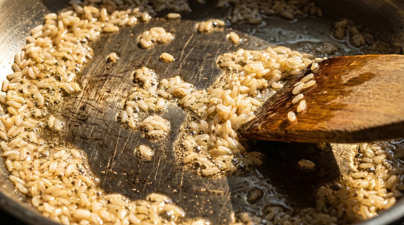 Empieza con el sonido. Un leve repiqueteo metálico que pronto se convierte en un siseo constante. En lugar de verter agua fría sobre una olla llena de granos opacos, dejas caer el arroz crudo y seco sobre una película de aceite caliente. El olor cambia casi de inmediato; pasa de ser polvo inerte a un aroma tostado, ligeramente a nuez, que inunda la cocina antes siquiera de que el primer trozo de cebolla toque el metal.