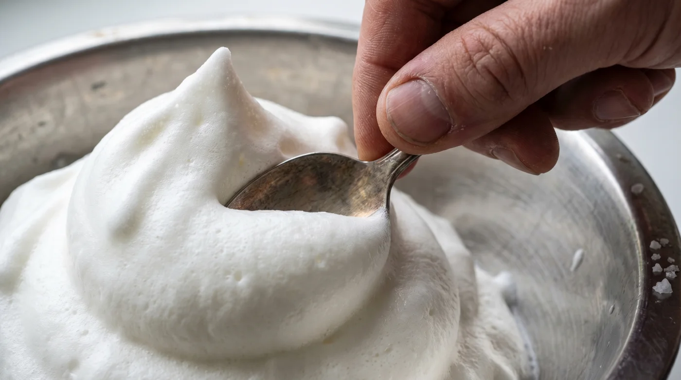 Si agregas azúcar en este punto, básicamente estás cubriendo ese ovillo apretado con cemento fresco. Se vuelve brillante y denso, pero increíblemente pesado. En cambio, si dejas caer una simple pizca de sal antes de dar el primer golpe, cambias las reglas del juego. La sal actúa como tijeras diminutas, cortando los nudos moleculares y permitiendo que la proteína se desenrolle.