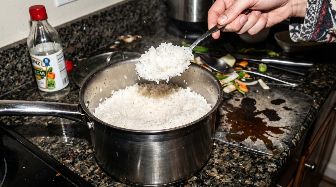 El vinagre blanco destilado de alcohol de caña es ideal porque es completamente neutro en color y muy volátil en sabor.¿Sirve igual si preparo el arroz frito primero?