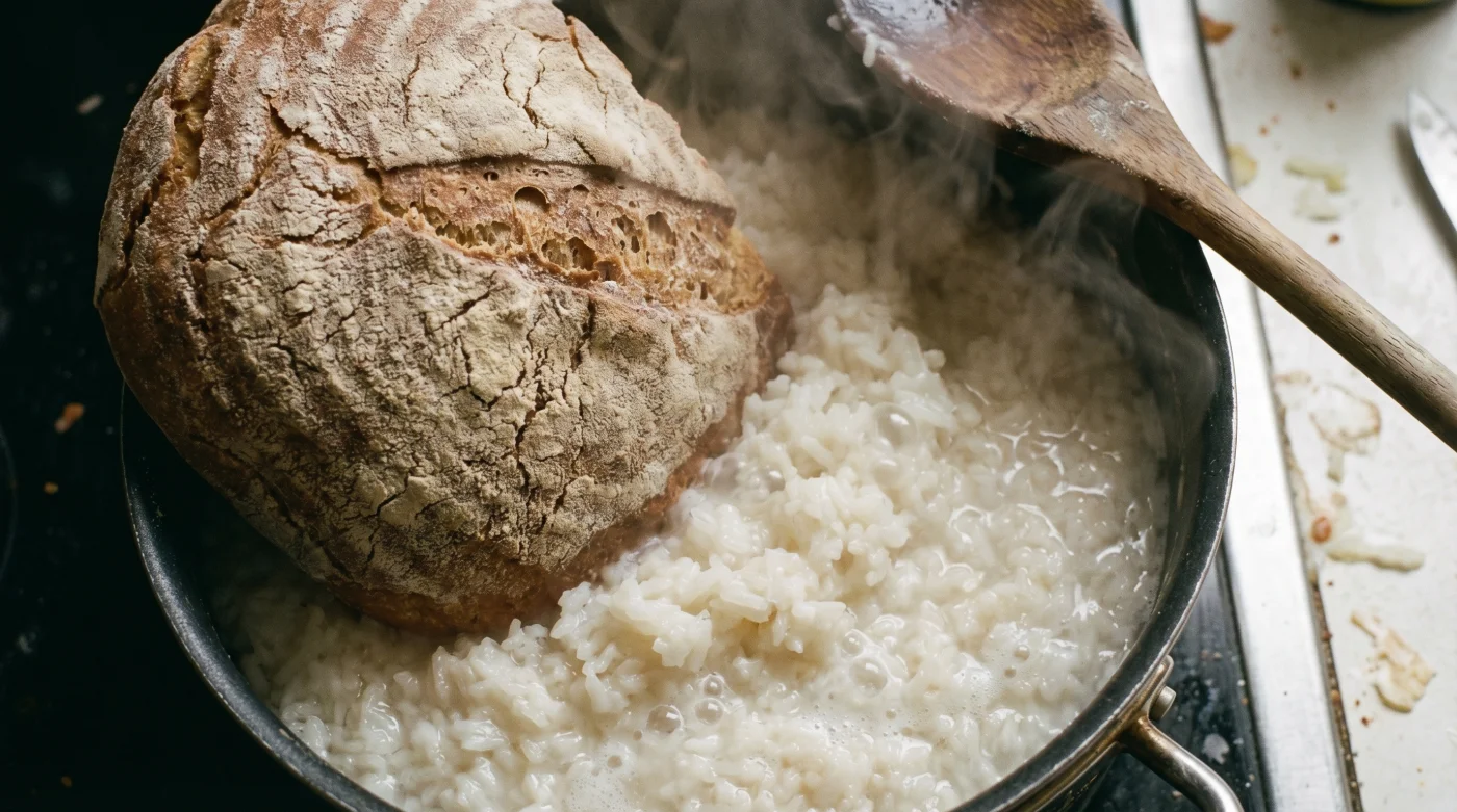 El arroz batido es víctima del agua residual que sigue rebotando dentro de la olla cerrada. Si logras extraer esa neblina caliente antes de que el grano la absorba por completo, la estructura exterior comienza a tensarse de nuevo. Aquí es donde el viejo bolillo duro, ese que dejaste endurecer desde hace un par de días, deja de ser basura para convertirse en una esponja de rescate casi milagrosa.