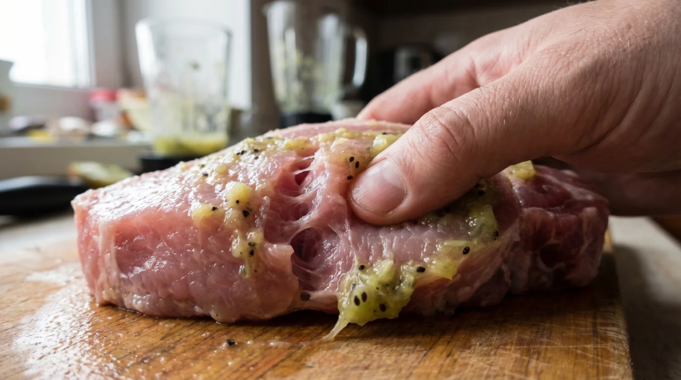 Este es el cambio de perspectiva que necesitas. La rigidez de una pierna o un lomo de cerdo barato no es una condena. Ese detalle mundano de licuar una fruta peluda se revela como tu mayor ventaja táctica en la cocina. La carne no necesita rendirse ante el ácido de los limones; simplemente necesita relajarse.