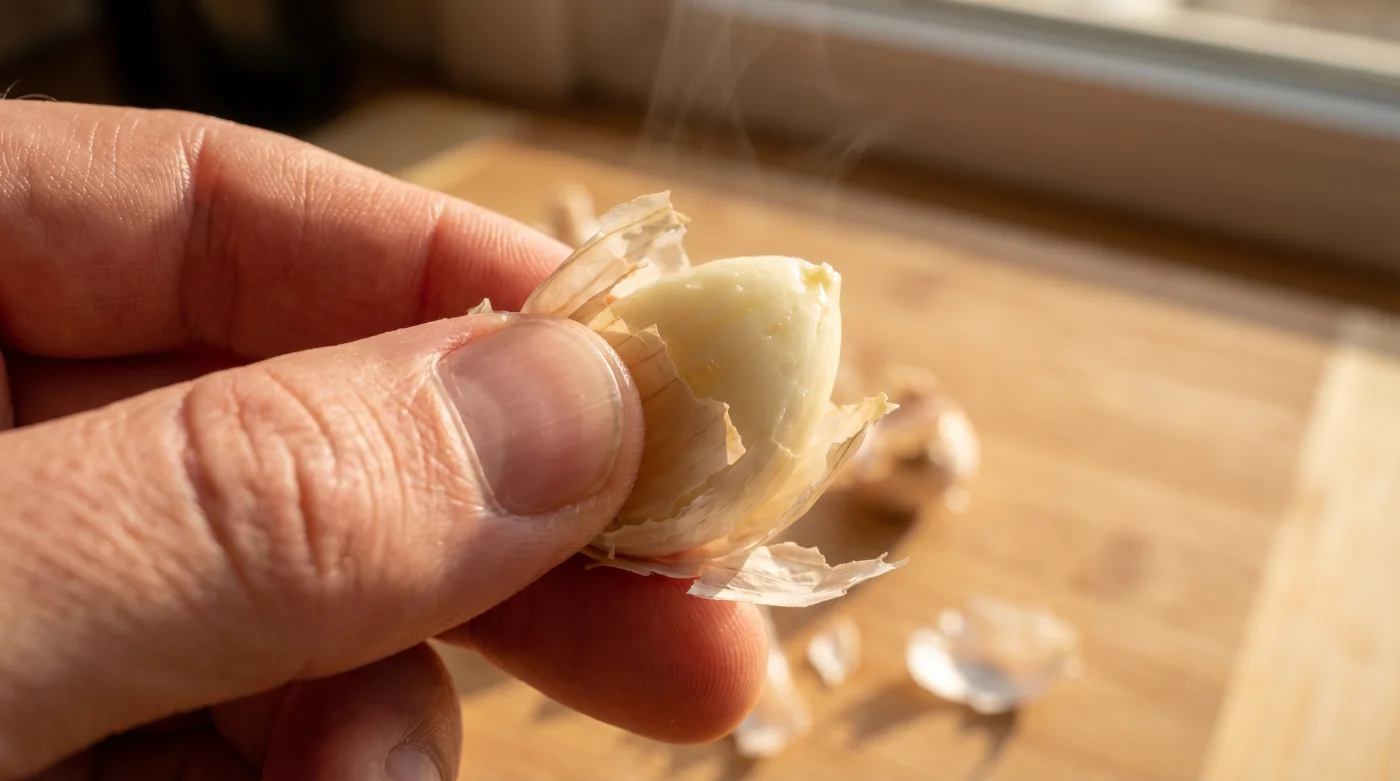 Cuando introduces un calor directo y agudo, la humedad natural atrapada justo debajo de esa fina capa exterior reacciona al instante. El agua minúscula se vuelve vapor. Este vapor invisible crea una bolsa de aire de alta presión entre la carne firme del diente y su vestido de celulosa. El ajo, sometido a esta temperatura exprés, suda literalmente su propia armadura, empujándola hacia afuera para que resbale sin que tú tengas que rasparla con las uñas.