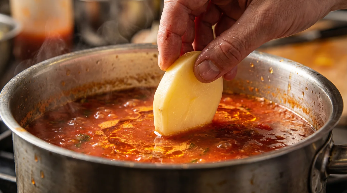 La verdadera cocina, la que ocurre en el día a día lejos de los reflectores, no se trata de no cometer errores, sino de saber cómo absorber el caos sin perder la postura. Hay un ingrediente humilde, terroso y siempre presente en el fondo del cajón oscuro de la alacena que funciona como una esponja biológica de emergencia. Una simple papa cruda puede transformar un desastre inminente, salvando esos 200 pesos de ingredientes, para devolverte un caldo redondo y equilibrado, todo sin sacrificar un gramo de la esencia de tu receta.