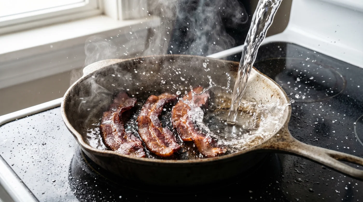 Escuchar el cambio de sonido es la verdadera técnica que Raúl domina. A medida que el líquido hace su trabajo de cocción interna y se evapora por completo, el tono en la estufa pasa de un burbujeo sordo y acuoso a un crepitar agudo y constante. Para cuando el sartén se queda sin agua, el tocino ya soltó su propia manteca y simplemente se fríe a sí mismo, nadando en un estanque uniforme que no salpica.