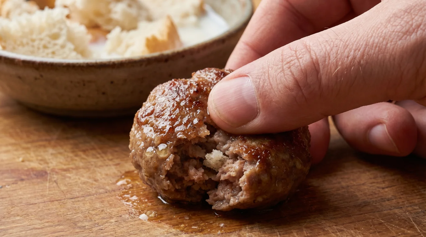 Aquí es donde entra la magia del pan. No es un simple relleno, es una red de seguridad. Al remojar pan en leche creas lo que en las cocinas francesas llaman una panade, pero que en las fondas de México conocemos simplemente como el truco de la abuela. El pan hidratado actúa como pequeñas esponjas microscópicas distribuidas por toda la mezcla.