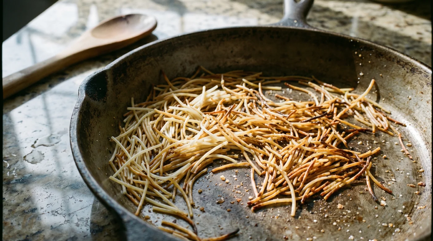 Si eres alguien que busca la profundidad del sabor tradicional, el camino requiere fuego bajo y paciencia. Tostarás el fideo en una mezcla de manteca de cerdo y aceite de cártamo durante unos cinco minutos, moviendo constante hasta lograr un dorado uniforme que aportará notas a nuez a tu caldo.
