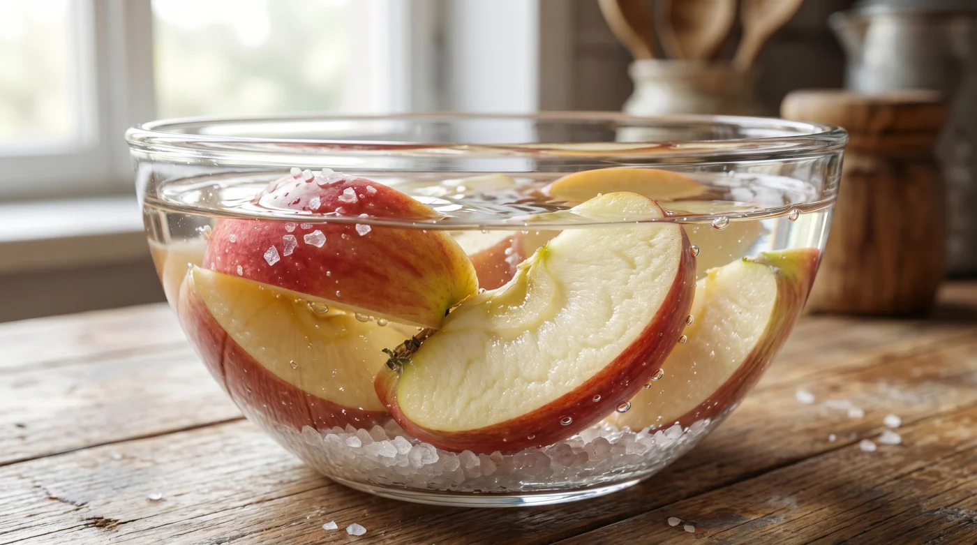 Primero, prepara el escenario antes de tocar el cuchillo. Llena un recipiente con agua de filtro y disuelve la sal. El orden es innegociable. Si cortas la fruta y luego buscas la sal, el oxígeno ya habrá ganado ventaja.