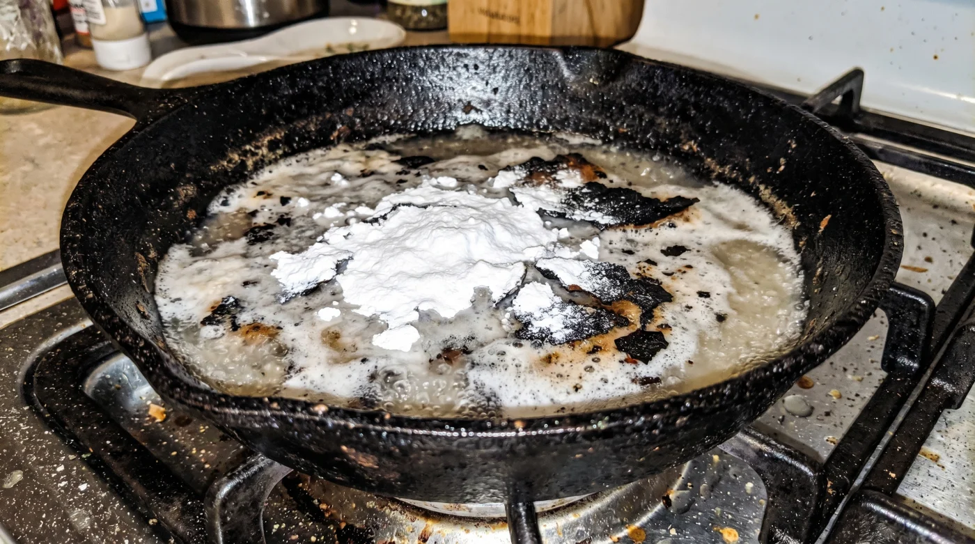 Al crear una solución alcalina con el polvo blanco y aplicar calor constante, rompes los enlaces de las proteínas y los azúcares carbonizados. Dejas que el agua hierva suavemente, permitiendo que las burbujas penetren por debajo de la costra, levantándola en láminas completas sin necesidad de raspar.
