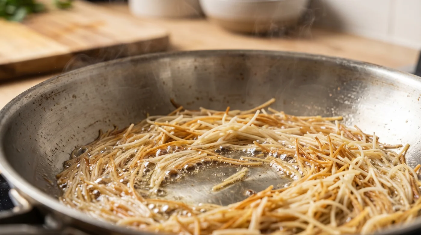 Para el padre de familia con prisa: Cuando tienes veinte minutos para poner comida en la mesa, la tentación de saltarse el dorado es grande. No lo hagas. Sube la flama a media-alta, vierte el aceite y mueve en círculos rápidos. Lograrás un tostado irregular (algunos fideos más oscuros, otros más claros). Esta imperfección aporta carácter visual y sigue siendo suficiente para evitar el desastre del almidón suelto, garantizando que puedas recalentar la sopa en la noche sin que sea un engrudo.