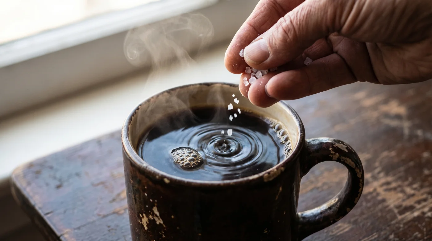 Si preparas tu bebida entera desde cero usando una cafetera de goteo o una prensa francesa, y sabes que esos granos específicos siempre te dejan un retrogusto seco, el momento ideal para intervenir es durante la extracción misma. Asegúrate de que el agua distribuya el sodio de manera uniforme mezclando la pizca de sal directamente con la cama de café molido seco antes de verter la primera gota de agua.