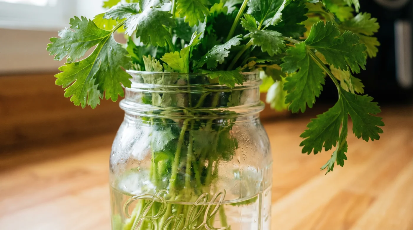 Piensa en un ramo de rosas. Jamás lo aventarías al fondo de la alacena dentro de una bolsa del súper. Lo colocarías en un florero con agua. El cilantro es una flor cortada de su fuente de hidratación primaria. Sus tallos son popotes biológicos que siguen sedientos, buscando desesperadamente agua para mantener la estructura celular de las hojas firme y turgente. Al proveer esa base líquida mientras proteges las hojas del exceso de sequedad, transformas la debilidad de la hierba en su mayor ventaja de supervivencia.