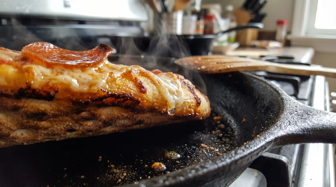 Las pizzas de masa gruesa, aquellas que te costaron quizá 250 pesos la noche anterior y ahora parecen ladrillos fríos, necesitan un empujón adicional. Su miga interior es densa. Ponlas en el sartén y, justo antes de poner la tapa, deja caer unas tres o cuatro gotas de agua en el borde del metal (lejos de la masa). Este siseo instantáneo genera una nube de vapor que penetra la costra gruesa sin mojar la base, resucitando el centro suave mientras el fondo se tuesta.