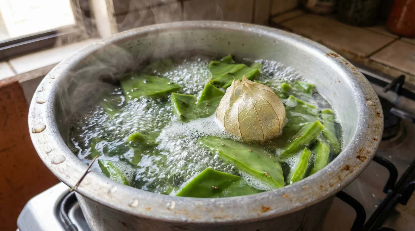 Doña Carmelita, una experta cocinera tradicional de sesenta y ocho años originaria de Milpa Alta, nunca midió niveles de acidez o pH en su cocina rústica. Ella simplemente tomaba las cáscaras secas que le sobraban de hacer la salsa verde para el chicharrón y las echaba a su inmensa olla de barro caliente. La sabiduría de su costumbre dictaba que este simple gesto separaba la baba, garantizando unos cortes de un verde esmeralda vibrante y una mordida perfecta para rellenar sus famosas gorditas de maíz azul tostado.