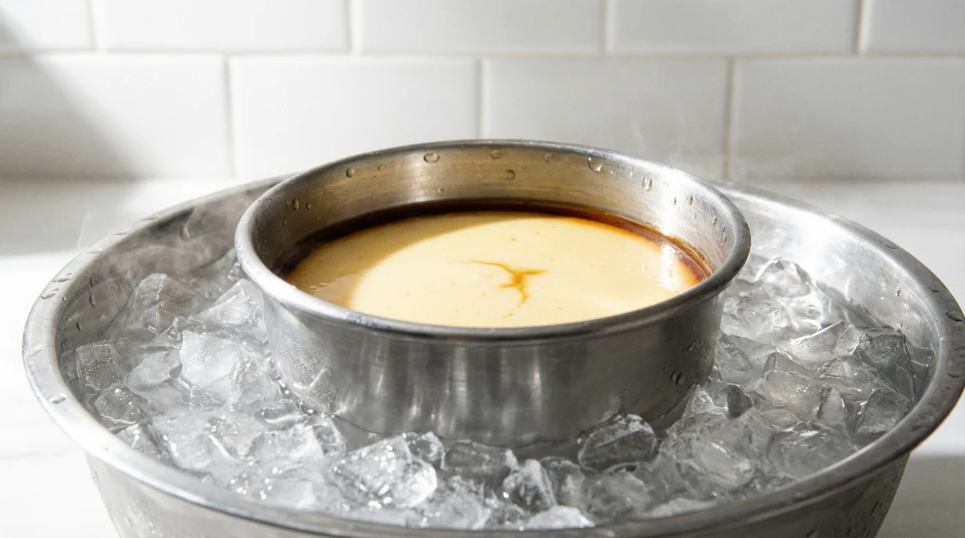 Sumergir un molde ardiente en agua helada parece a simple vista un acto de violencia culinaria, pero realmente es un acto de preservación. Al detener abruptamente la subida de temperatura, obligas a las proteínas a quedarse quietas en su punto de mayor suavidad y cremosidad.