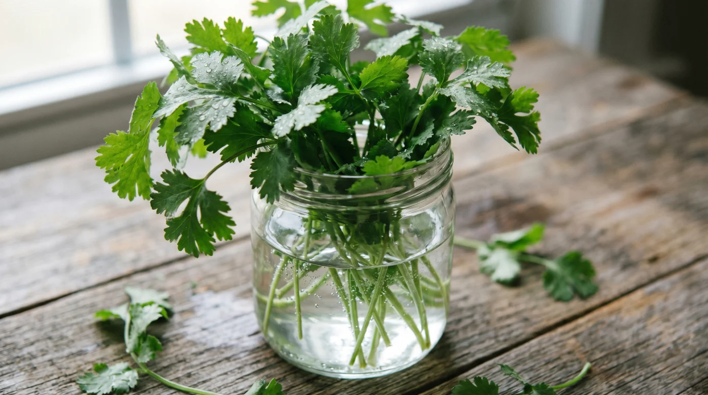 Imagina por un momento que alguien te regalara un ramo de rosas preciosas. Jamás las tirarías al fondo de un cajón oscuro esperando que sobrevivan intactas. El cilantro requiere exactamente el mismo respeto floral para mantener su vitalidad. Al recortar su base y sumergir sus tallos en agua fresca, reactivas inmediatamente su sistema circulatorio capilar. De pronto, actúas como el florista de tu propia comida, creando un micro-ecosistema estable donde la hierba puede seguir bebiendo a su propio ritmo.
