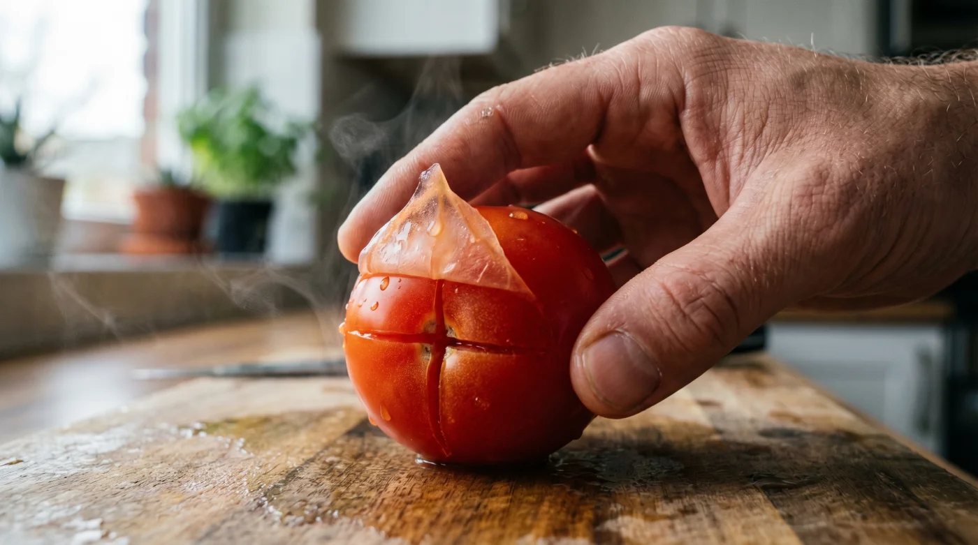 Imagina que la cáscara del jitomate rojo es como una camisa demasiado apretada. Cuando el fruto entra al calor extremo del agua hirviendo, la carne de su interior se expande rápidamente. Si no le ofreces una vía de escape natural a esa presión acumulada, la piel se adhiere aún más o revienta por donde puede, llevándose pedazos valiosos de carne consigo.