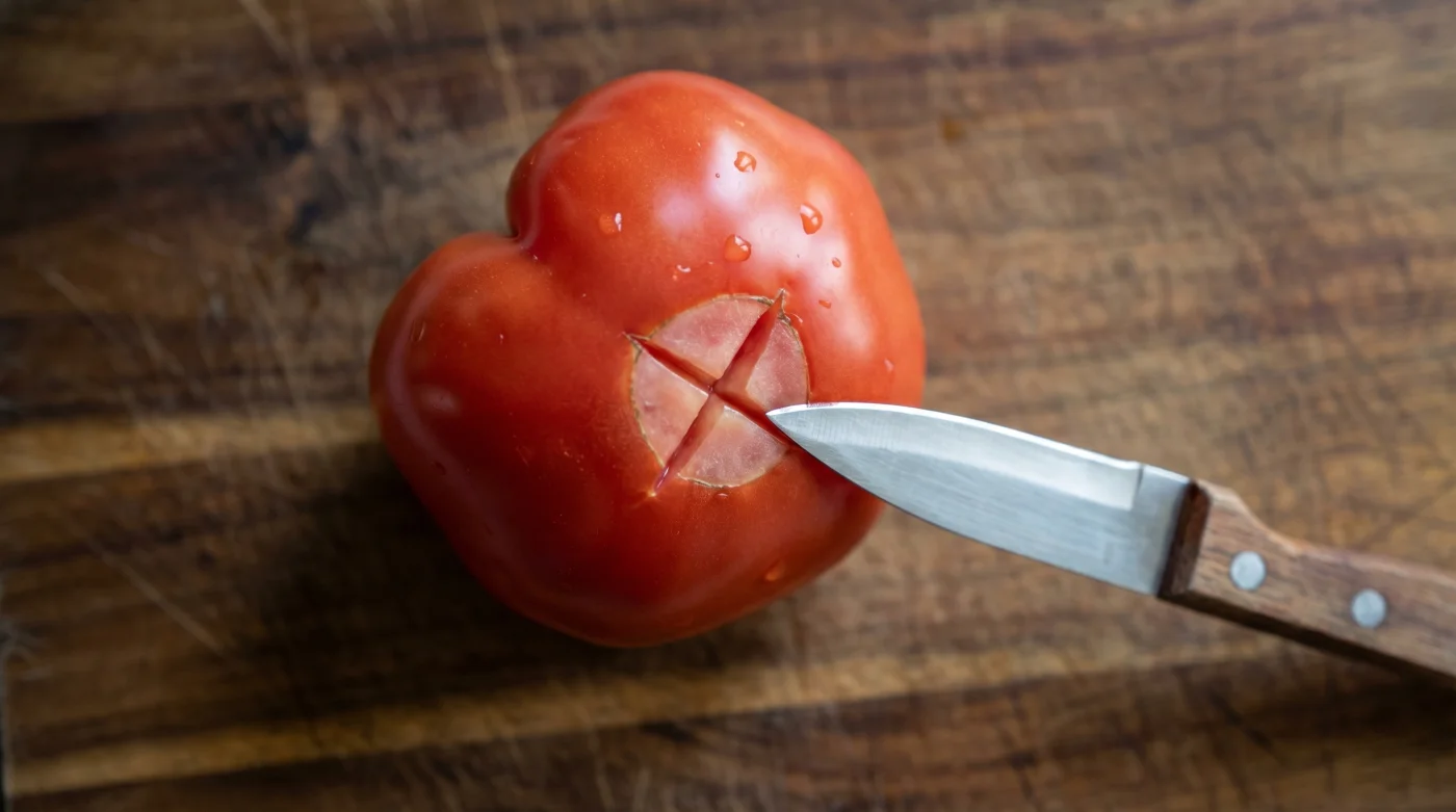Ese pequeño corte superficial en la base es todo lo que necesitas para cambiar el comportamiento del fruto. Al trazar una simple marca en forma de cruz en la parte inferior, estás rompiendo la tensión elástica de la cáscara. De pronto, lo que parecía un defecto molesto se convierte en tu mayor ventaja táctica. Al entrar en contacto con una temperatura extrema, la piel reacciona al instante, encogiéndose desde los bordes del corte y separándose de la pulpa sin llevarse un solo gramo del sabor que necesitas para tu platillo.