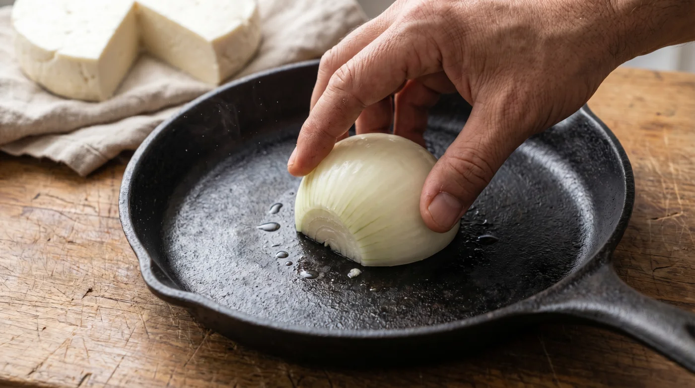 Para el purista del comal: Si mantienes vivo el uso del hierro fundido tradicional para tus desayunos, sabes que el calor residual es implacable. En este caso, la media cebolla no solo deposita la capa antiadherente vital, sino que su humedad ayuda a recoger las cenizas finas o los rastros de almidón que dejó la tortilla anterior. Aplica la cebolla con movimientos circulares y presión constante.