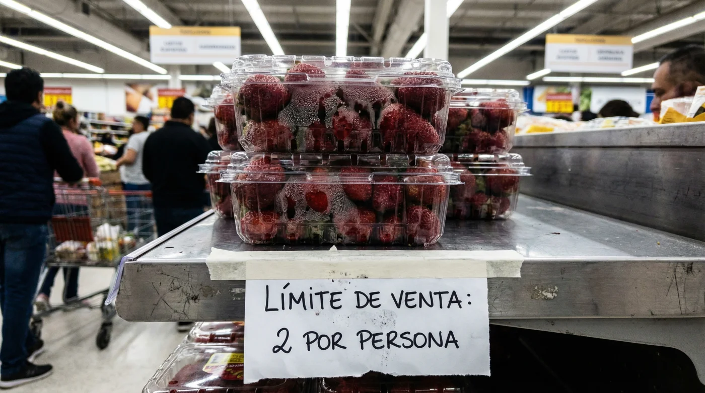 En lugar de las pirámides habituales de empaques transparentes apilados sin aparente fin, te encuentras con un espacio semivacío y un pequeño cartel de cartulina amarilla. Un aviso simple y directo que limita la venta de fresas frescas a solo dos cajas por familia. La sorpresa te detiene un segundo; de repente, ese producto cotidiano se siente escaso, casi como un bien sumamente codiciado en medio de la rutina de compras semanales.