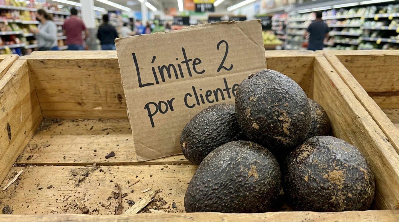 Pero la montaña hoy es apenas una colina irregular. Extiendes la mano y notas un letrero discreto, casi tímido con letras negras: ‘Máximo 2 kilos por cliente’. El aguacate Hass se siente diferente bajo tus dedos. Más pequeño, con una piel que parece más tensa y corrugada de lo habitual, como si la fruta misma estuviera conteniendo la respiración en tus manos.