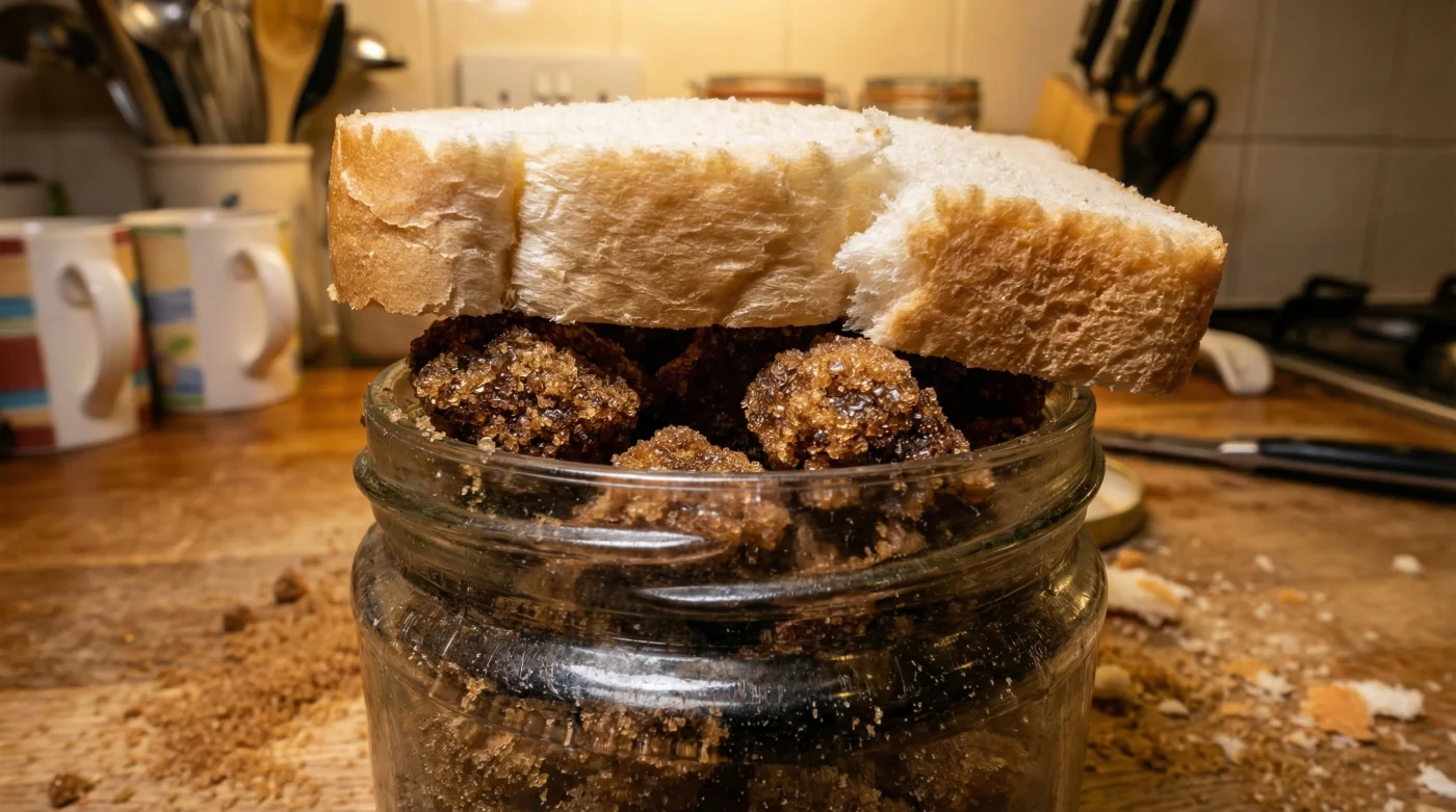 Si revisas tu receta y te das cuenta del problema una tarde antes de hornear, la rebanada de pan de caja blanco es tu táctica insuperable. Es un ingrediente neutral, extremadamente barato y, lo más importante, no transfiere sabores ajenos a la melaza. Introduce el pan directamente apoyado sobre la gran roca dulce, cierra el frasco a presión y vete a descansar. Es la reparación menos invasiva y la que respeta escrupulosamente la integridad física de los cristales dulces.