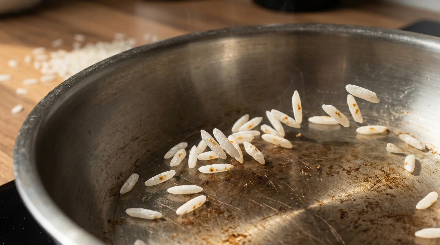 Esta técnica contradice frontalmente la regla dorada del lavado exhaustivo. En lugar de intentar arrastrar el polvo de almidón por el desagüe y perder nutrientes, lo tuestas en seco hasta caramelizarlo ligeramente.