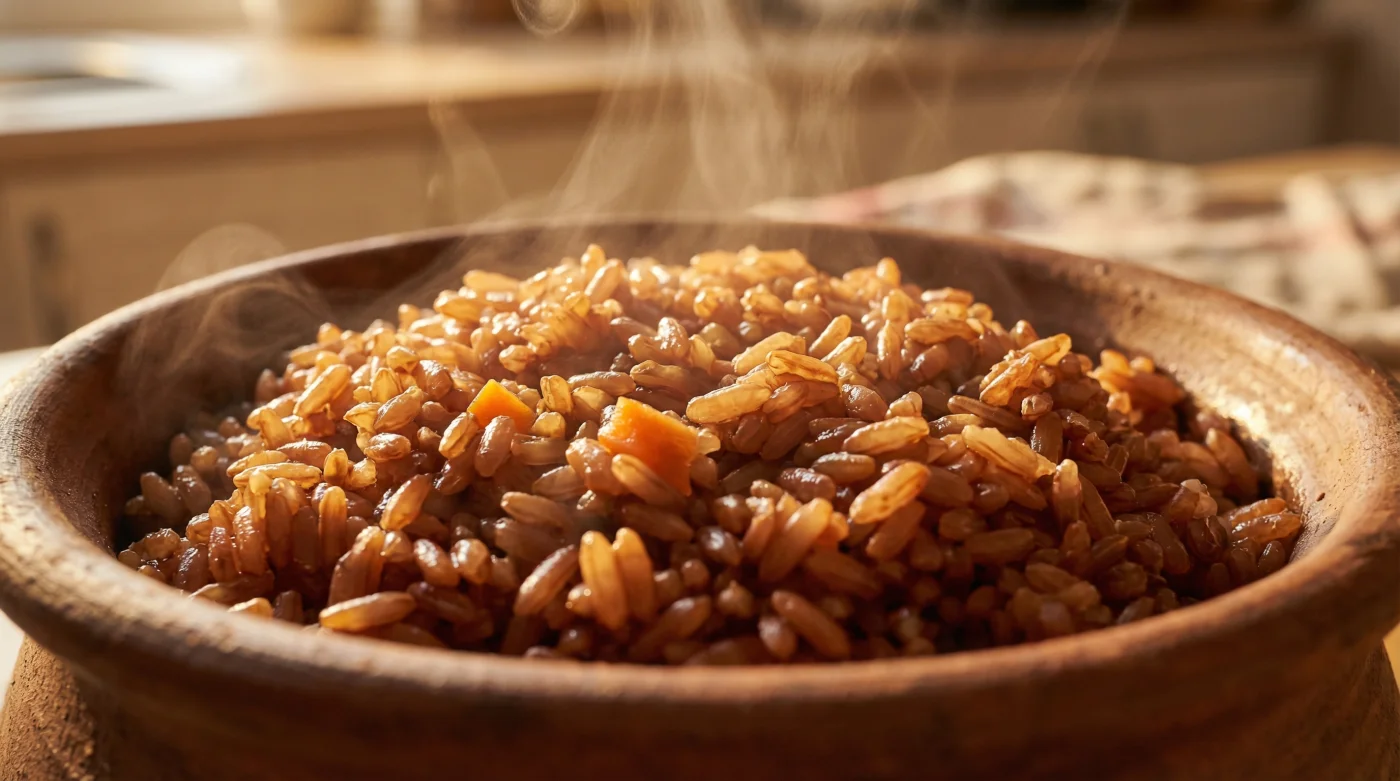 Un arroz rojo esponjoso, humeante, donde los granos caen sueltos y enteros sobre el plato hondo, representa una victoria silenciosa sobre el caos y la prisa del día a día. Es la confirmación física de que los grandes resultados en tu cocina no requieren siempre inversiones de miles de pesos, sino simplemente aplicar una mirada más atenta y compasiva a lo que ya descansa frente a ti.