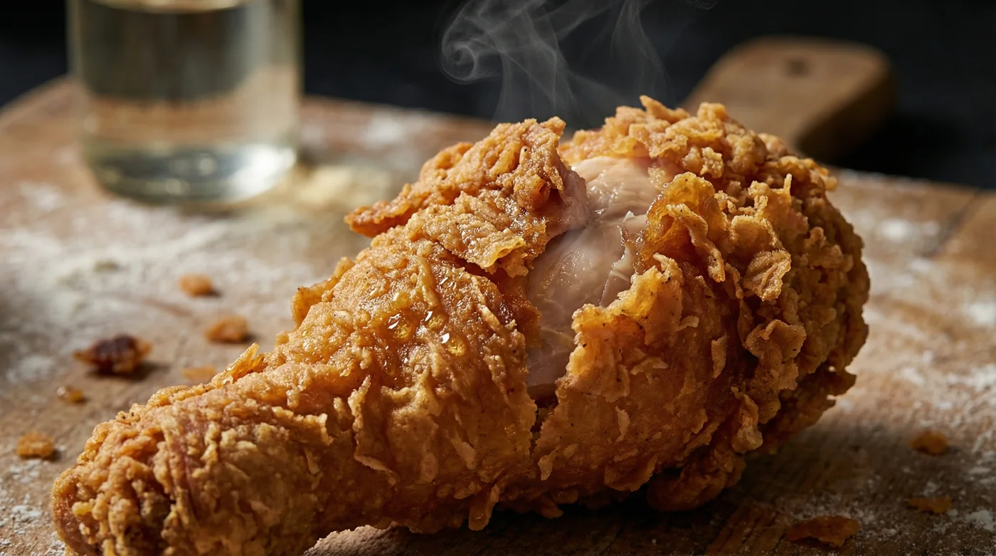 Si amas el clásico sabor sureño con suero de leche, no lo elimines. El truco está en la estación de empanizado. Mezcla tu harina con las especias secas. En un tazón aparte, combina media taza de suero de leche (o leche cortada con limón) con un cuarto de taza de vodka. Sumerge el pollo en el líquido y luego presiona la harina con fuerza. La mezcla creará grumos gruesos que, al freírse, formarán esas escamas extra crujientes por las que todos pelean.