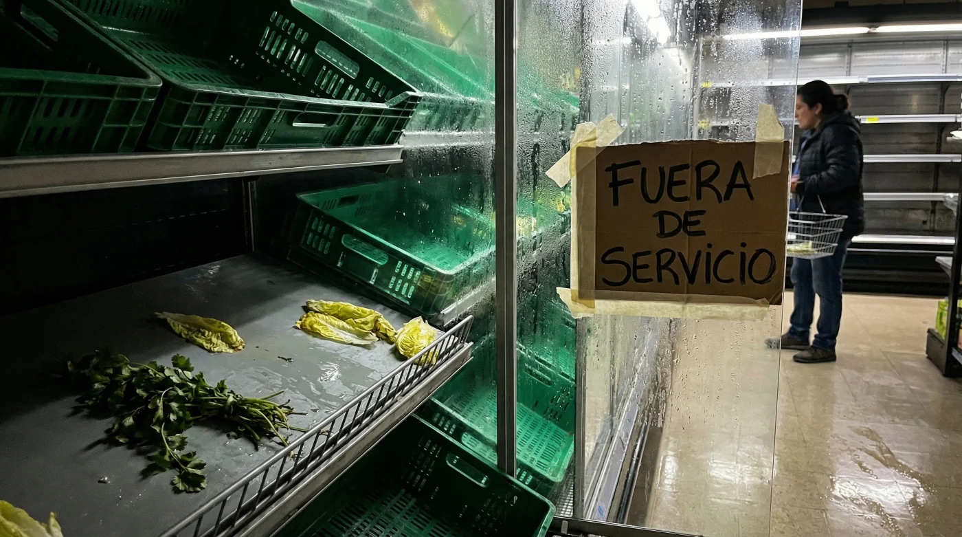 Sin embargo, hoy te recibe una hilera de cajas vacías, plástico negro brillante y un discreto letrero de disculpa impreso en papel bond. La neblina artificial está apagada, dejando al descubierto el fondo estéril de los estantes donde habitualmente reposan las espinacas tiernas, las acelgas robustas y las lechugas romanas que tenías planeado llevar con el descuento promocional. El vacío se siente casi antinatural en medio del brillo incesante del supermercado.
