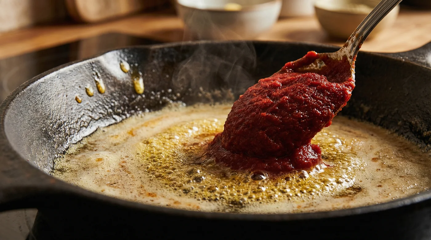 La costumbre dicta que la pasta de tomate es un simple espesante, un recurso cromático de último minuto para teñir caldos pálidos. Pero en las cocinas donde el oficio pesa mucho más que la prisa, nadie disuelve este puré concentrado en líquido frío o tibio; lo someten a un verdadero bautismo de fuego y grasa. Los cocineros saben que el tubo o la lata no entregan un producto terminado, sino una materia prima que exige transformación.