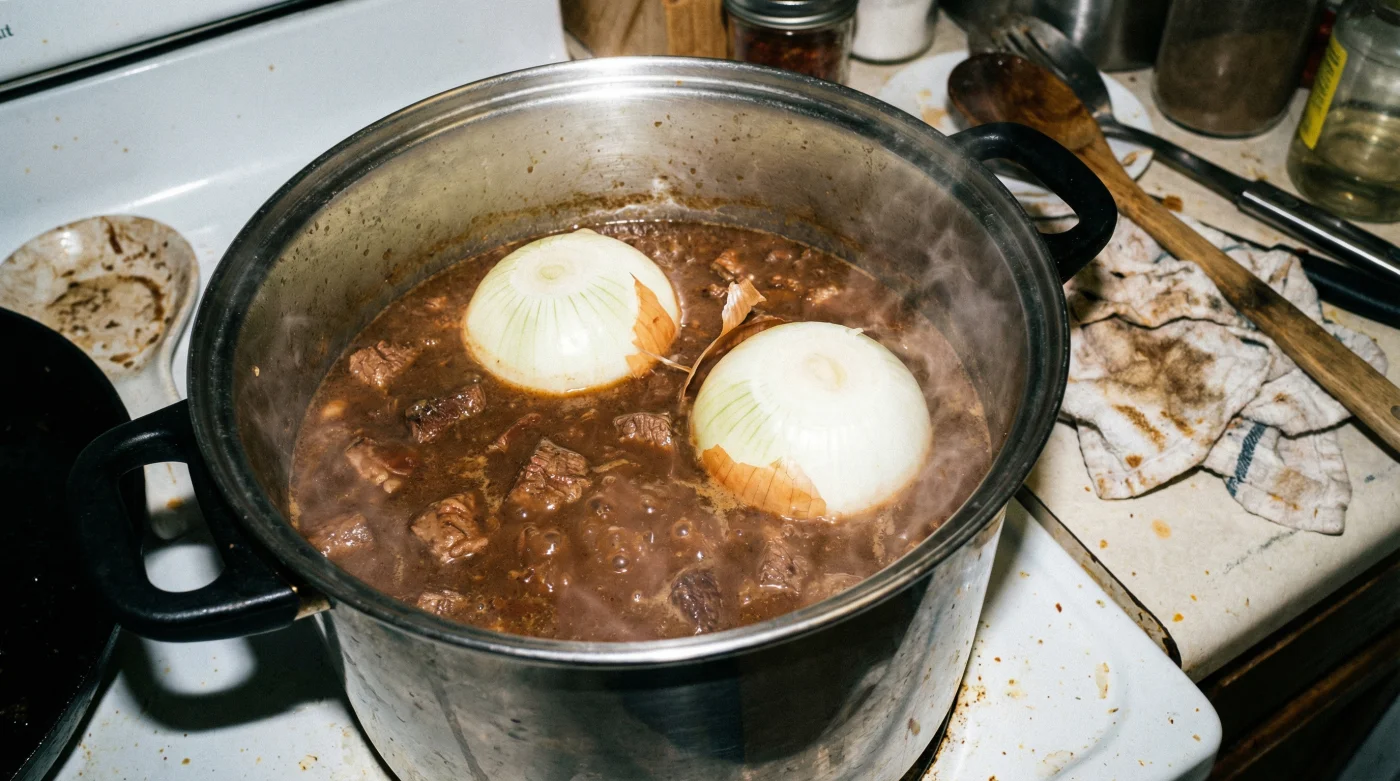 Aquí entra el secreto de entender tu olla como ecosistema. La solución no es agregar más sal, ni azúcar, ni especias para intentar tapar el desastre. La respuesta está en una cebolla blanca y cruda, cortada por la mitad. Sus capas actúan literalmente como una esponja química, atrayendo y atrapando esas moléculas amargas antes de que se fijen en la proteína o en las papas. El defecto se convierte en una ventaja: el ligero toque ahumado que queda, una vez filtrado el exceso, puede darle una profundidad rústica e intencional al plato.