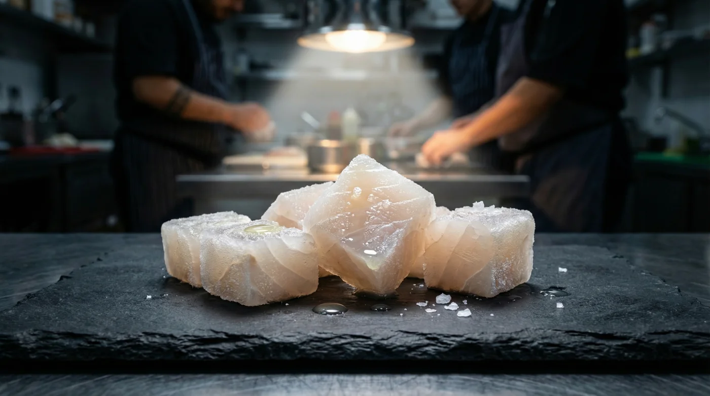 Durante esos breves minutos bajo cero, el agua entre las células forma cristales invisibles que apuntalan la carne desde adentro. El pescado deja de ser una esponja vulnerable y se transforma en una estructura sólida, dispuesta a recibir el filo del acero sin oponer resistencia ni desmoronarse entre tus dedos.